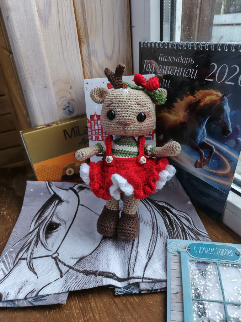 Вот и у моей двери остановились новогодние сани с подарками. Моя феечка @Natali-B прислала мне коробку с мешком сладостей, вкусным чаечком, новогодним полотенчиком, календарем и прелестной игрушкой. Мои девочки уже ходят за мной хвостиком с просьбой поиграть олененочкой. Но я пока держусь, подумываю поставить ее на новогодний стол.