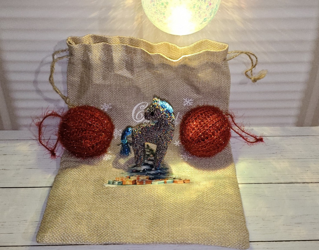 А ещё шарик светящийся, моточек пряжи и самое главное.... красивущий холщовый новогодний мешочек, а в нём лошадка из необычной искрящейся пряжи и вязаные шарики для ёлочки :homyak: :homyak: :homyak: .