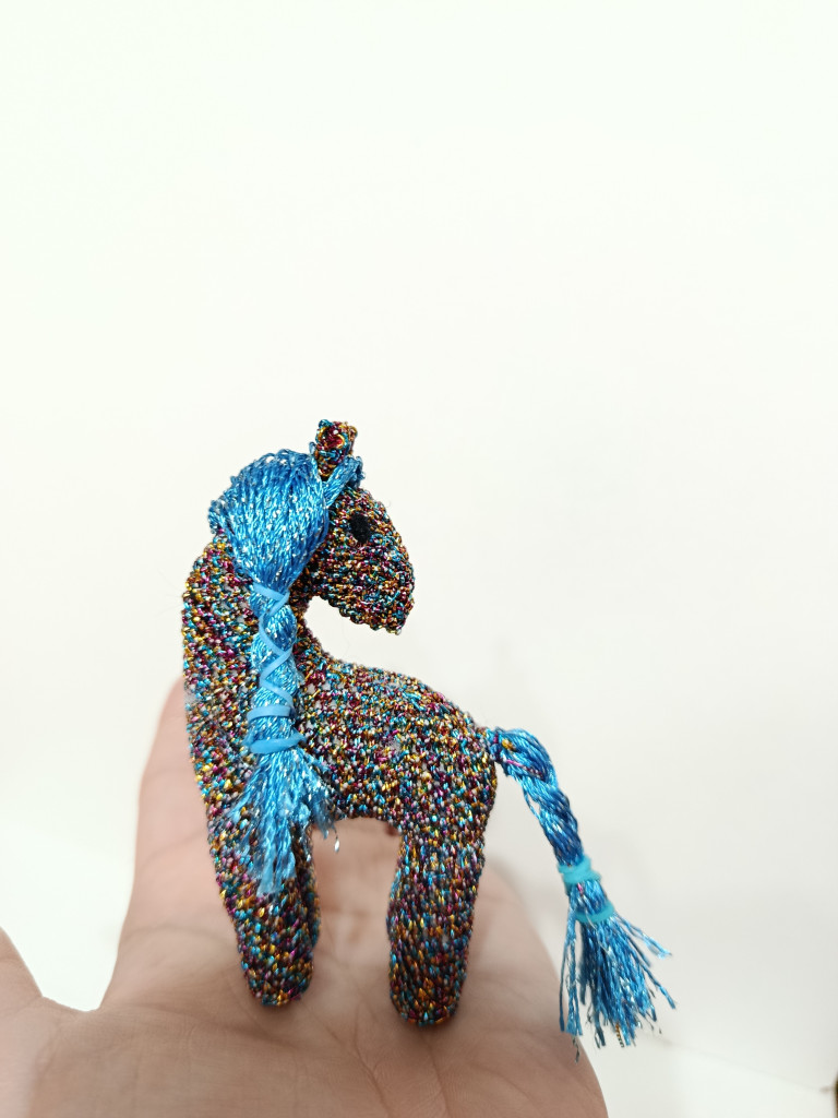 Лошадка связана из хлопка в фольге, действительно необычная пряжа, я бы сказала как раз новогодней расцветки)
