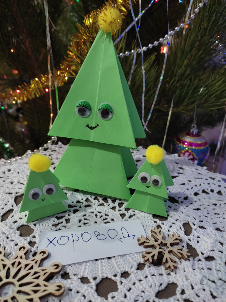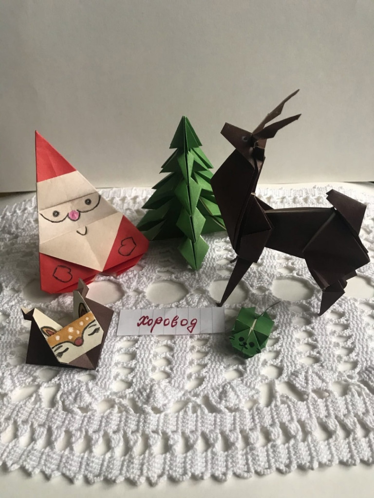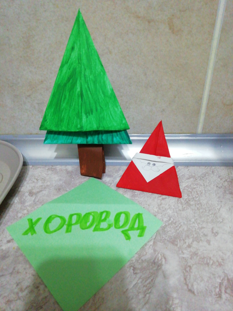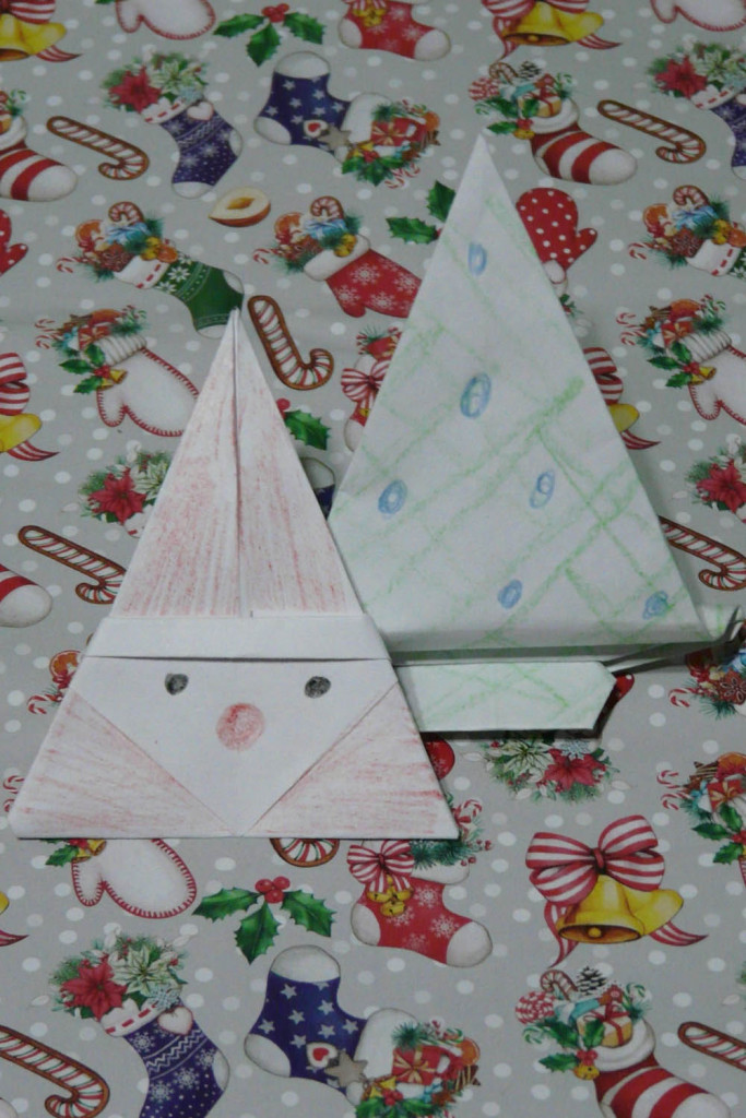 Привет. Вот так задание, я из бумаги только самолетик и лодочку могу сделать. Вот взрослая тетя, сижу и изучаю искусство оригами. Цветной бумаги нет, поэтому в ход пошли карандаши, но видно плохо. Вот что вышло - дед мороз и елка.
