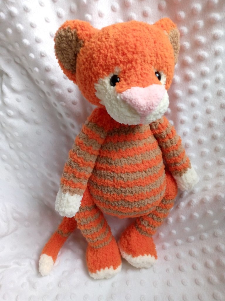 Тигреночек Пух ростом 35 полосатых см связан в интенсиве с PolushkaBunny из пряжи Щелкунчик от Колор Сити (без травки) в две нити и Софти Плюс от Ализе спицами 3 мм, лапки на пластиковых суставах, глазки-пуговки