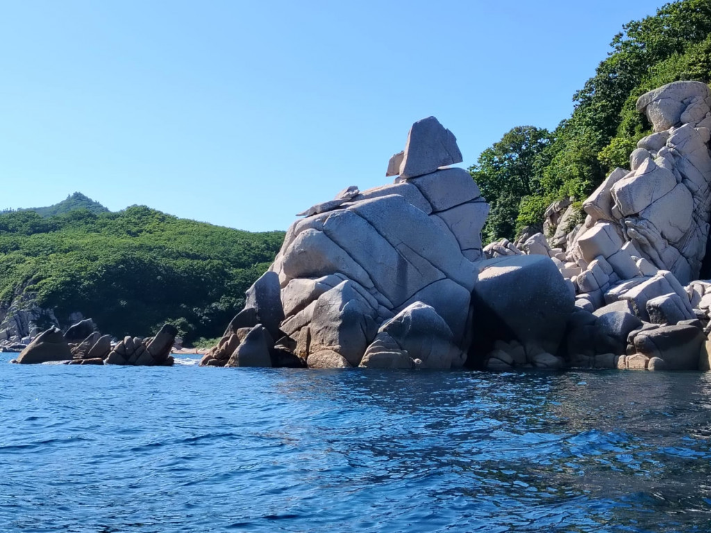 Сейчас будет Спокойная. Я первый раз вижу настолько прозрачную чистую вкусно пахнущую воду, вот что значит, когда не заходят корабли.. На фото глубина офигеть какая, видно дно, песок, водоросли.. Кажется - спрыгни с сапа и иди по дну.. А под тобой метров огого в это время.. Цвет воды удивительный, камни огромные непонятно почему всколыхнули во мне внутреннего инка или майю.. Они такие большие, грандиозные, а ты стоишь, человечишко.. Муравьишка просто.. И слов нет от восторга, от всей этой красоты пейзажей..