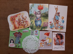 Такие милые рисунки на открытках. :pardon: Мышоночек с тюльпаном, жирафик, мишутки, девчуля с тортиком. Прелесть! :adore: