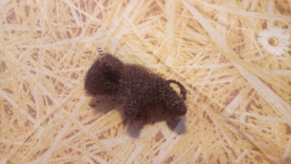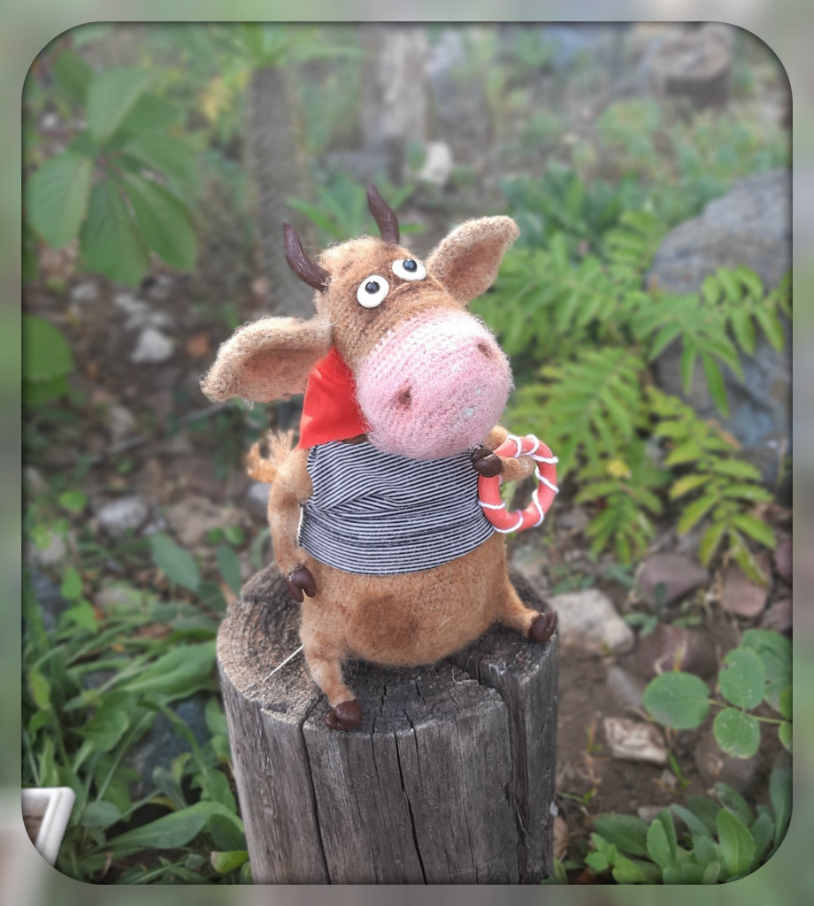 Бычок- черный бочок.<br />Связан спицами. Мой авторский МК.<br />На каркасе, крутит шеей и хвостом, двигаются ножки