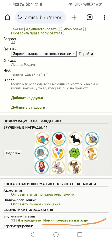 Мисс Кэт писал(а): 29 янв 2024 09:31 @Тажини ,самый простой способ - написать тут героя, которого представляешь на награду. Второй способ - давай посмотрим, нажимаешь на ник человека и там, на его страничке, где награды - Номинировать. Давай проверим на тебе?)