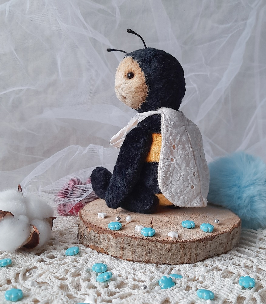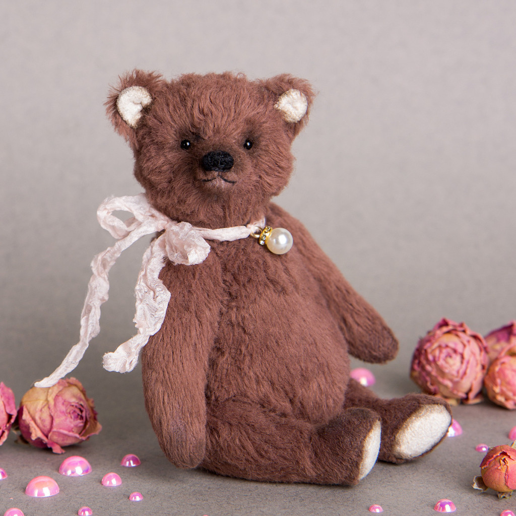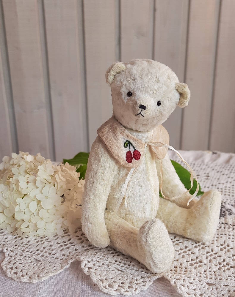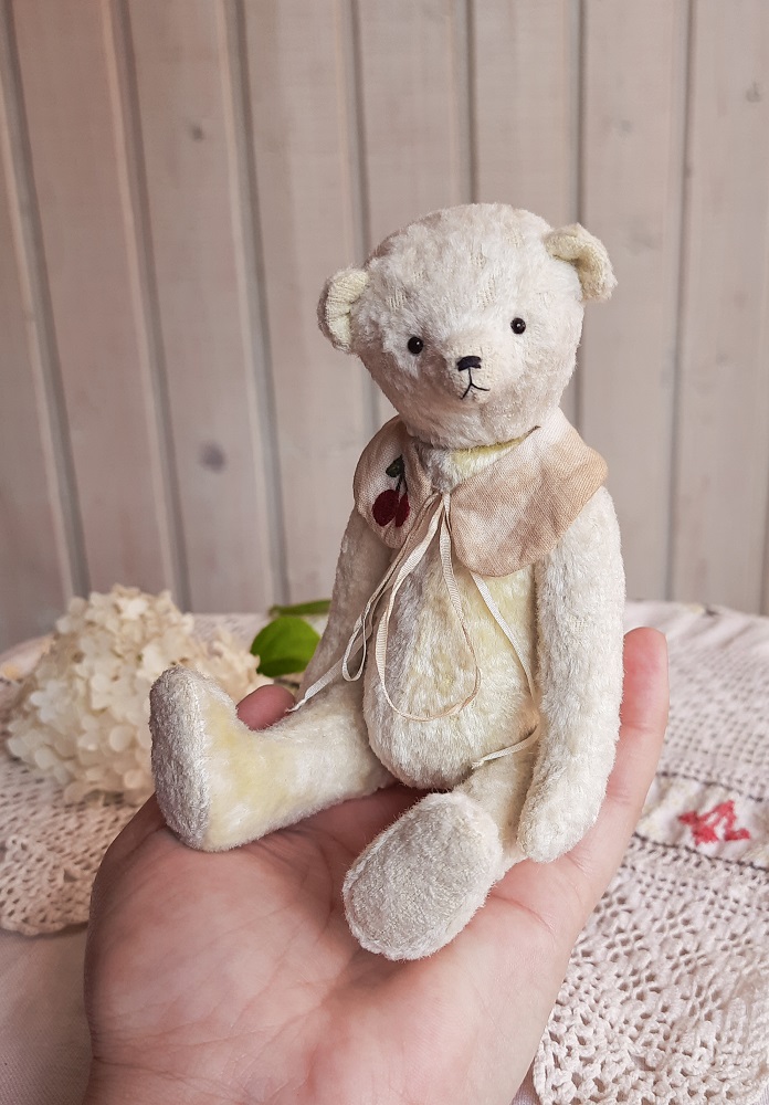 Рост мишки 14 см. Материалы: итальянская вискоза, опилки, древесная шерсть, гранулят, шплинтовое крепление головы и лап.
