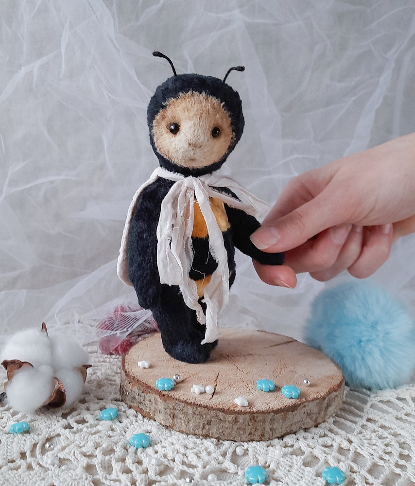 Мишутка росточком всего 8,5 см. Самостоятельно стоит и сидит. Подвижные лапки и голова (шплинтовое крепление), глазки из стекла. Внутри ароматные опилки. Сшит из плюша. Выкройка своя.