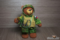 Медведь в амуниции связиста. Радиостанция содержит советские радиоэлементы, съёмную антенну и индивидуальный камуфляжный чехол. Тактический бронежилет плитник с функциональной системой креплений. Композитная каска: усиленная основа плюс камуфляжный чехол.