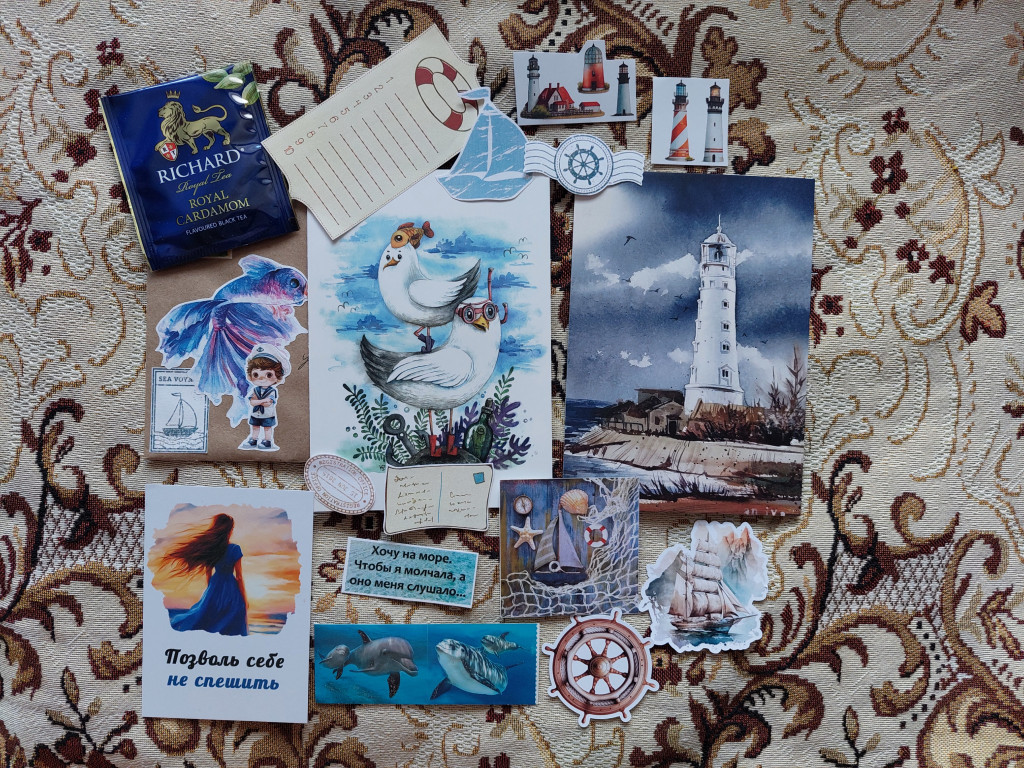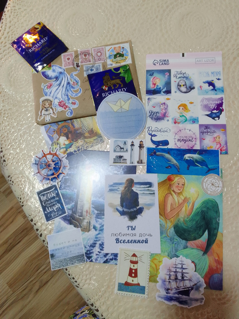 Я тоже получила обменный конвертик от Наташи @totoshka . В нём красивые морские открытки, много нужностей для оформления (наклеечки, вырубки) и даже вкусный чай. Оформление конверта и открыток классное, в морском стиле. :yes: