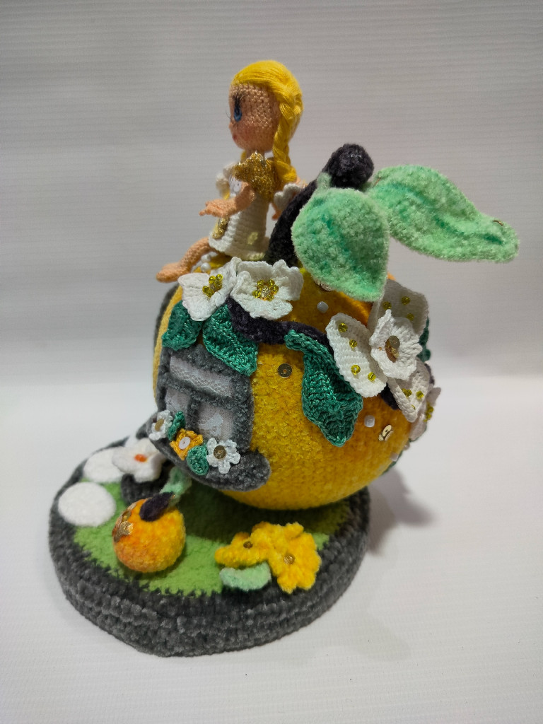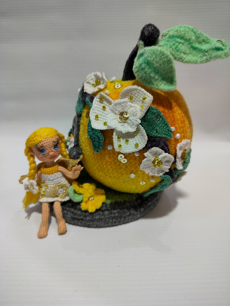 Высота яблока с подставкой около 15см, феечка 8см.