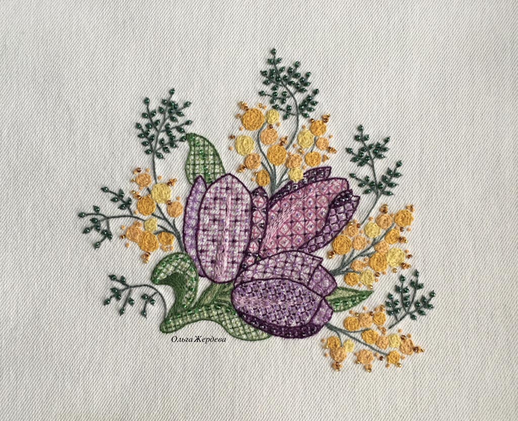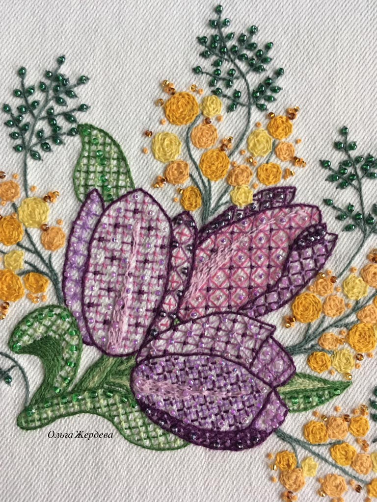 Вышивка в якобинской технике. Нитки - шерсть. МК Ольги Шумиловой. Называется "Весенний букет".