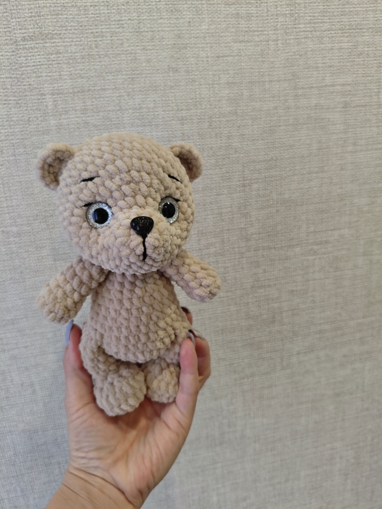 Кевин. Мостиком 12 см, связан из английской меховушки (похожа на минк ). Шплинтовое крепление конечностей, носик и пяточки из поилмерки. Утяжелен металлическим гранулятом.