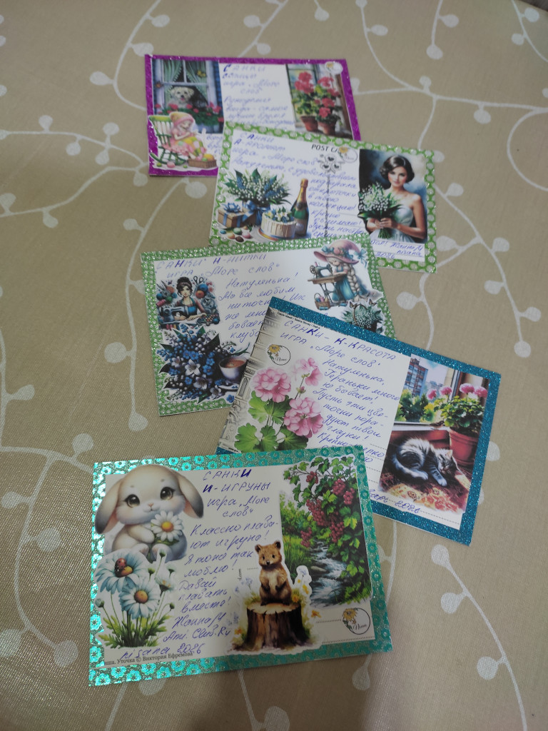 Следующий участник пишет "Отправлю" и подбирает(не показывая) 5 открыток, которые подходят под 5 загаданных букв. Например : а- открытка с аистом ,б- береза,ч- чашка и так далее ,на что-то вас хватит фантазии) Затем пишет свои буквы.