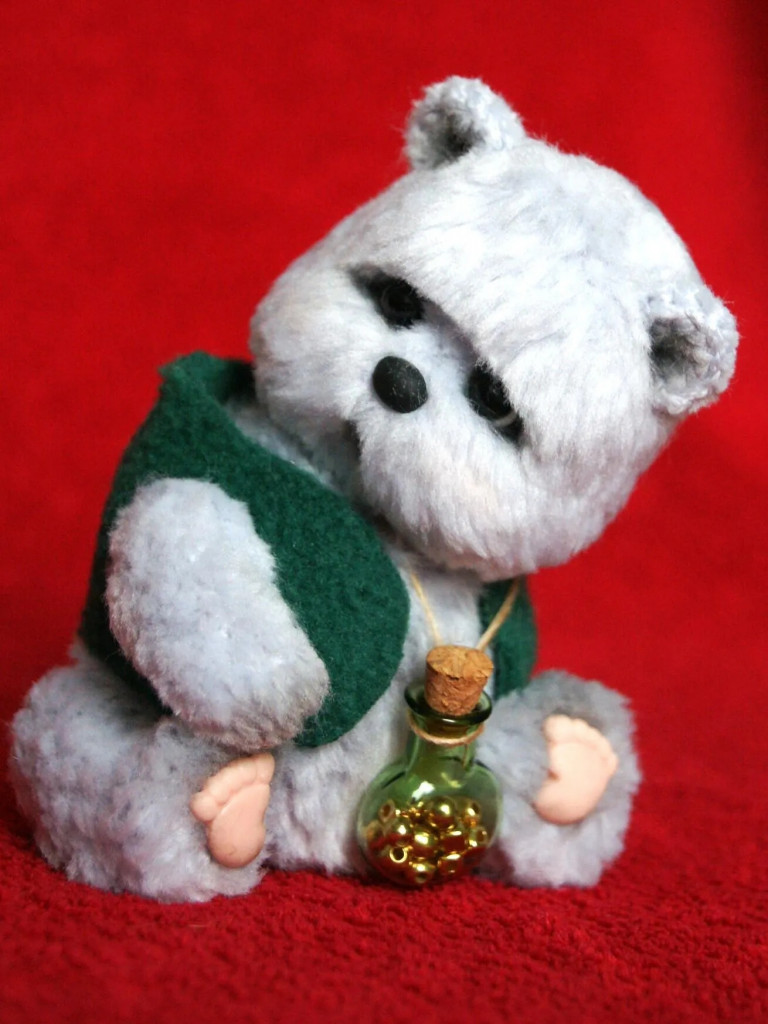 Кевин. Мостиком 12 см, связан из английской меховушки (похожа на минк ). Шплинтовое крепление конечностей, носик и пяточки из поилмерки. Утяжелен металлическим гранулятом.