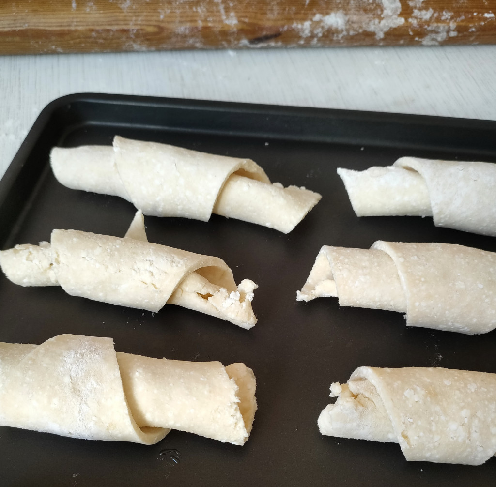 Быстро замесить тесто, разделить на 2 части. Каждую часть раскатать в круг толщиной до 0,5 мм, разрезать на 8 секторов. Далее см. фото. Выпекать примерно 20 мин. При температуре 200 градусов.