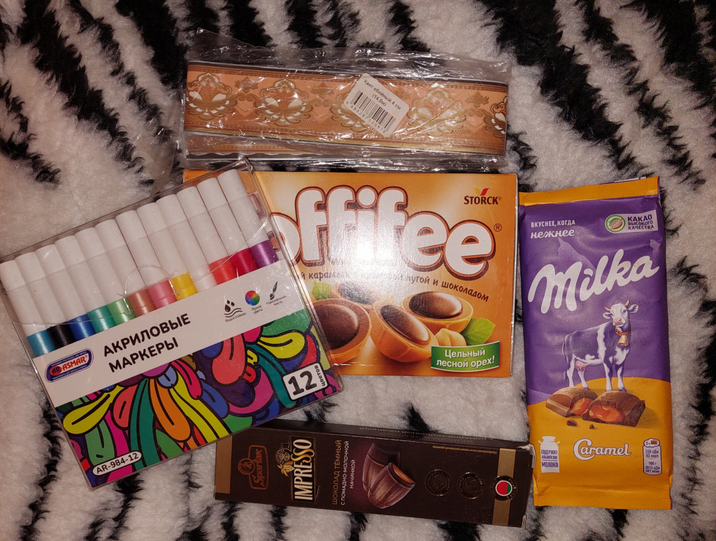Сладости, маркеры акриловые. Ещё ко мне приехали вот такой смешной житель в красивой косметичке с блёстками.