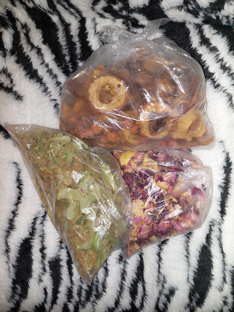 Много припасов для здоровья: липовый цвет, лепестки роз, сушёные разные фрукты и ягодки.