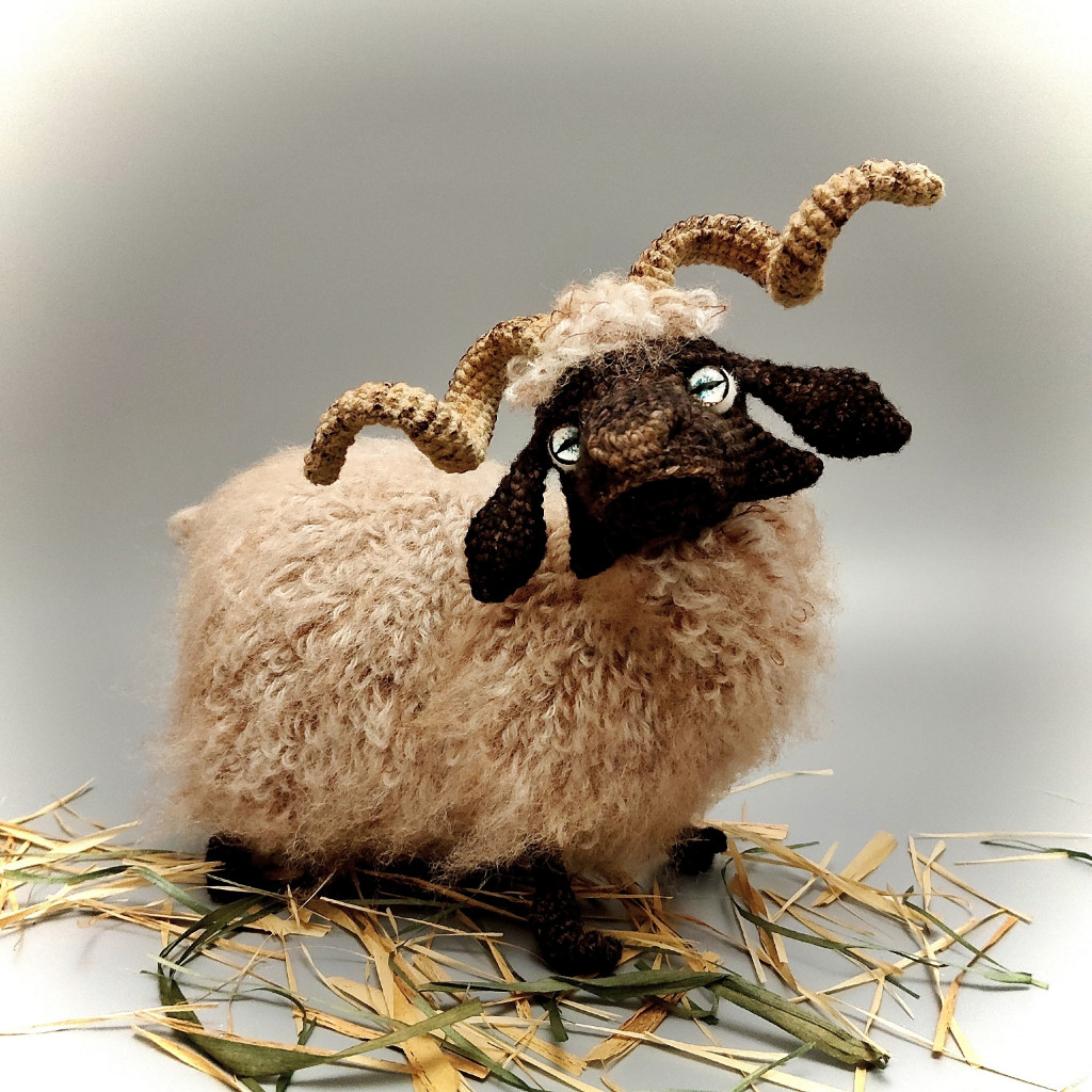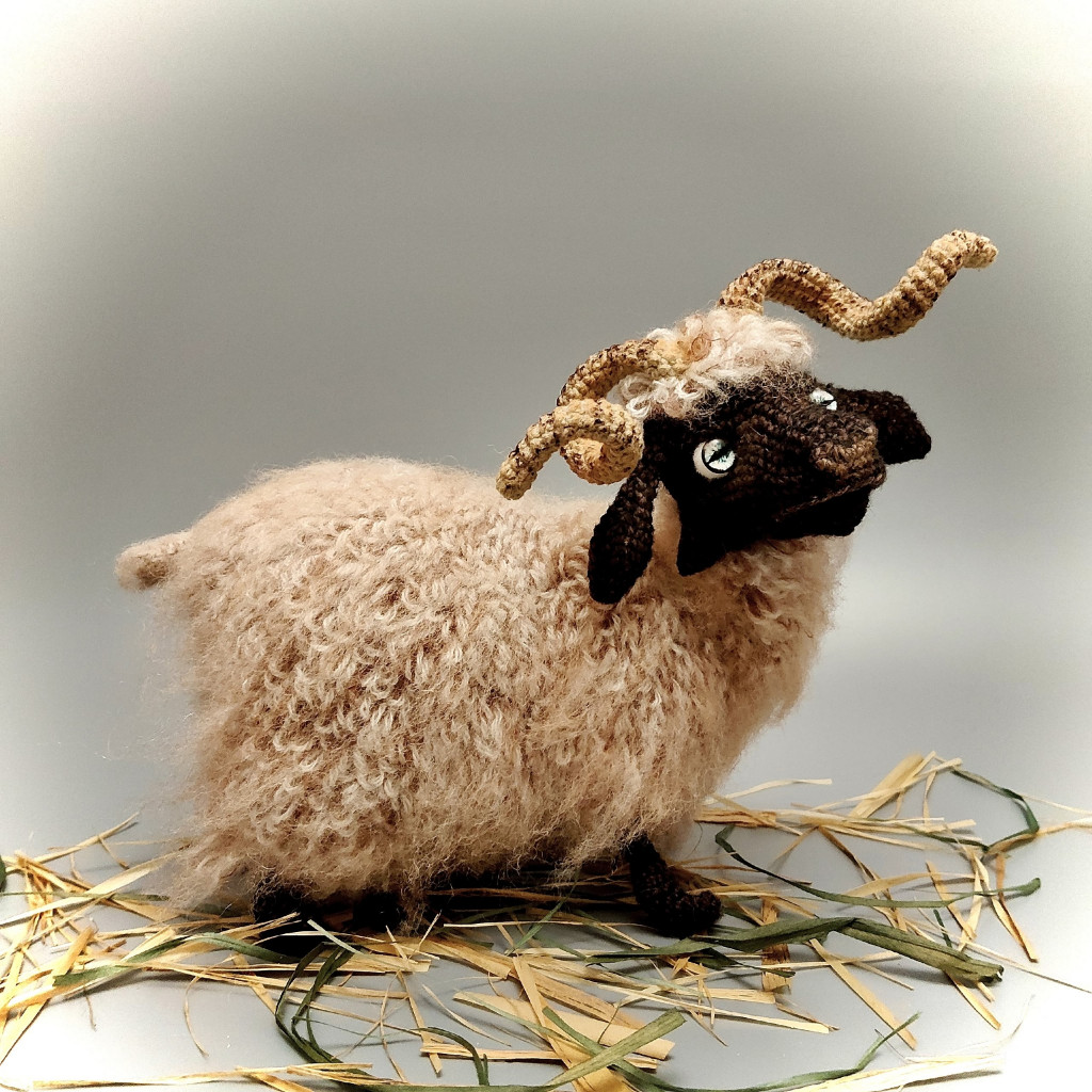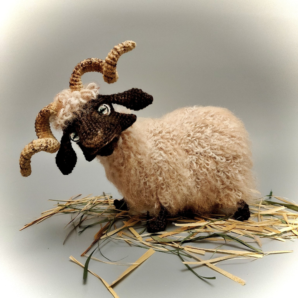 Основные характеристики - Игрушка цельновязанная, без пришивных деталей, нужно будет только сшить несколько отверстий, но там все очень просто. Внутри – проволочный каркас, можно будет поднимать/опускать/поворачивать голову, сгибать ноги в коленях, менять положение ног. Основное положение – стоя, можно усадить. Размер игрушки, связанной из пряжи 100гр-260м, у меня получился 16х18см. Размер без учета рогов и хвоста.