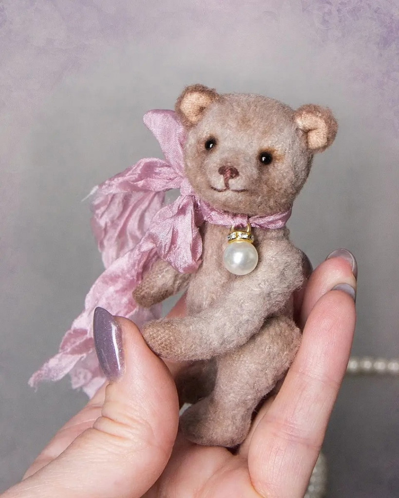 Мишутка росточком всего 8,5 см. Самостоятельно стоит и сидит. Подвижные лапки и голова (шплинтовое крепление), глазки из стекла. Внутри ароматные опилки. Сшит из плюша. Выкройка своя.