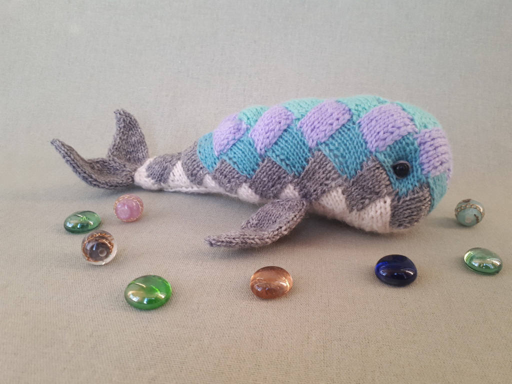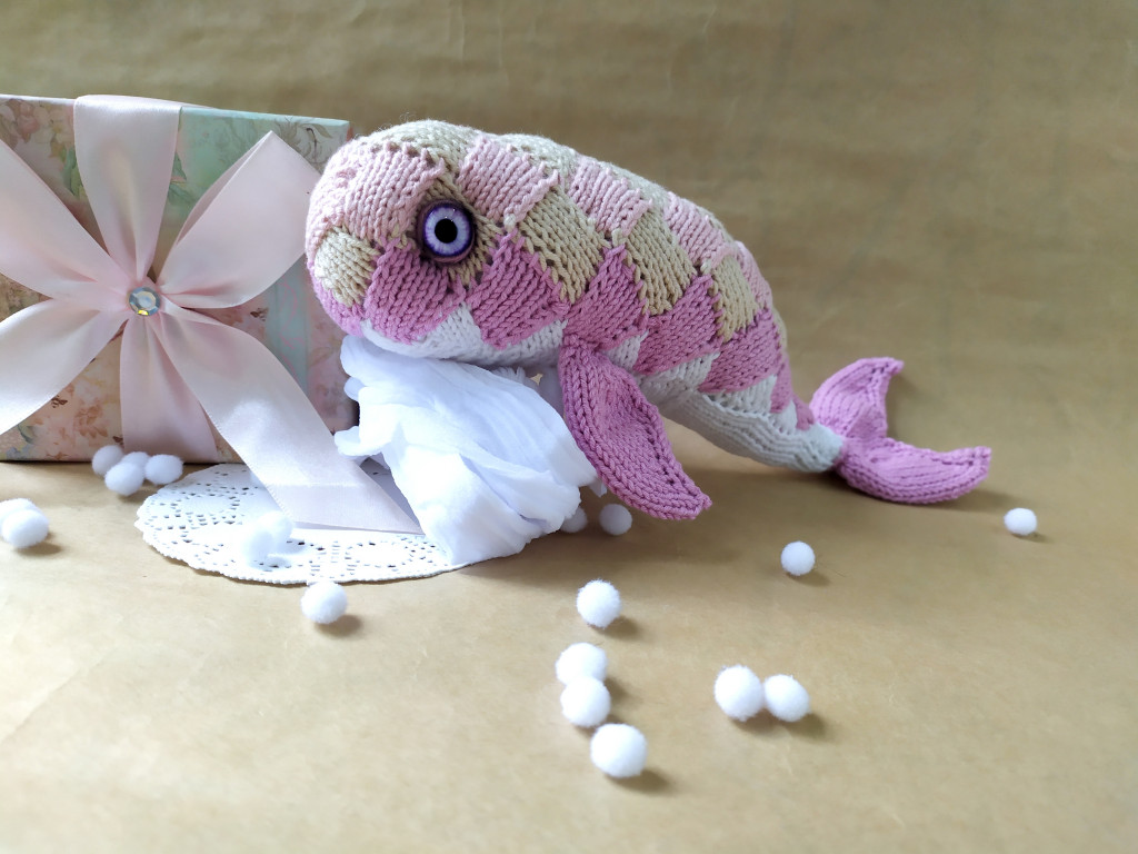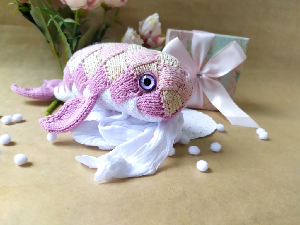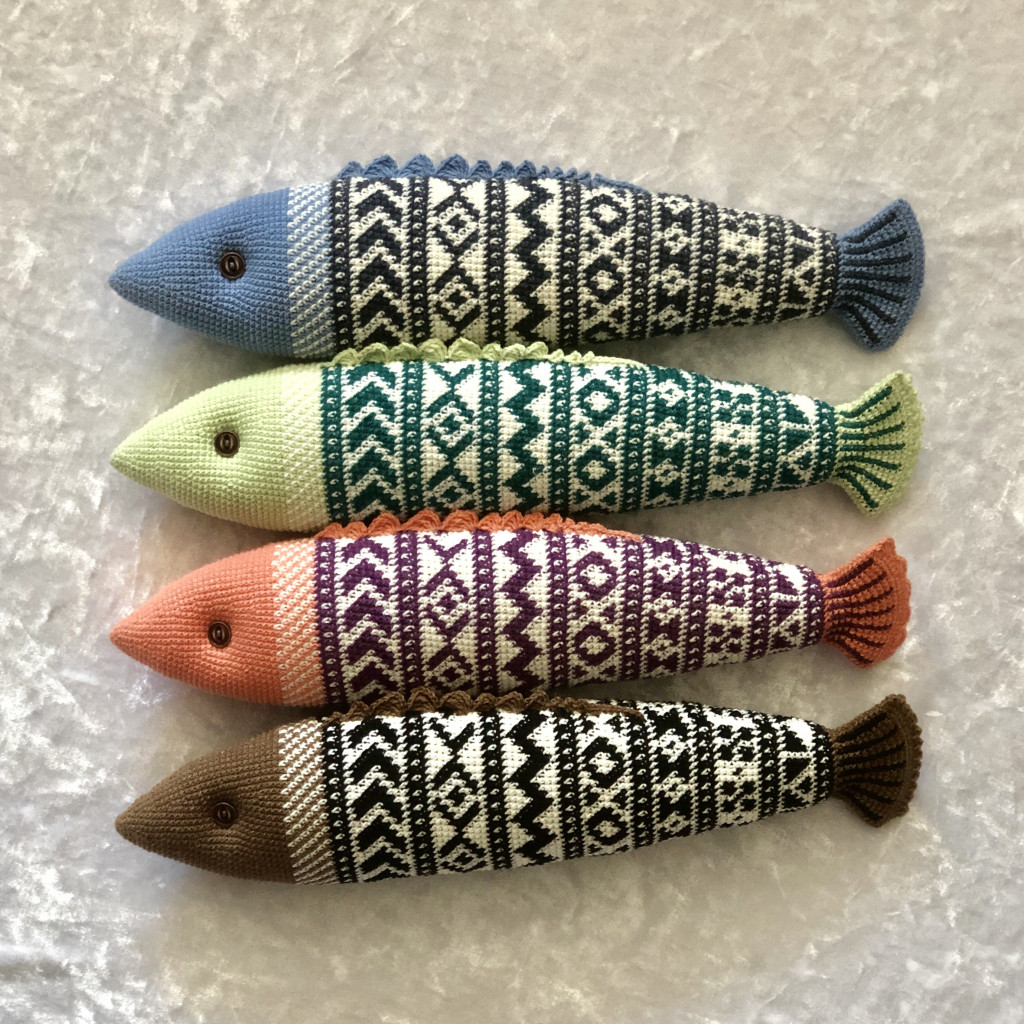 Я решила, что хочу жаккардовую рыбу, и сначала связала большого спицевого толстолобика из шерсти и секционного акрила.