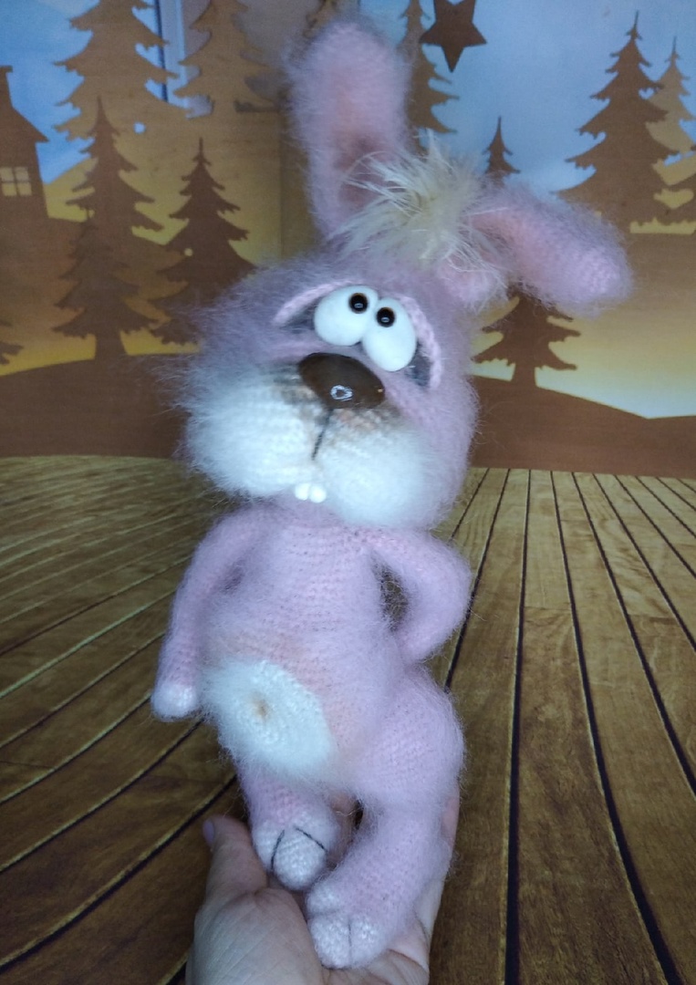 Этого зайца я пыталась связать на конкурсе,но у меня закончились нитки, размахнулась,он получился примерно без ушей 40-45 см