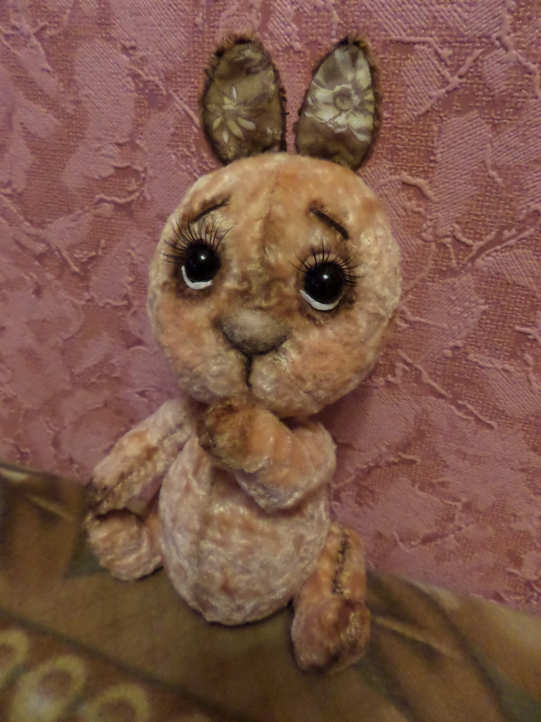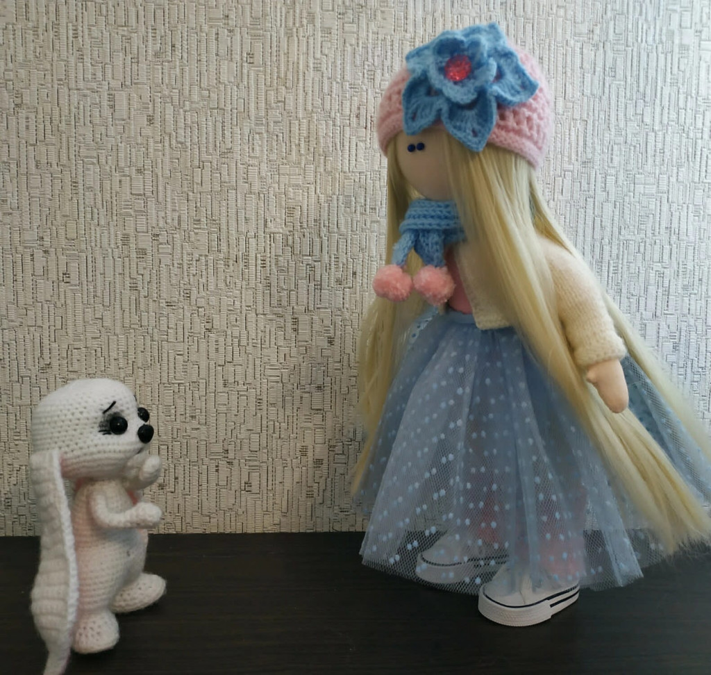 Сшитая куколка и вязаный зайчик