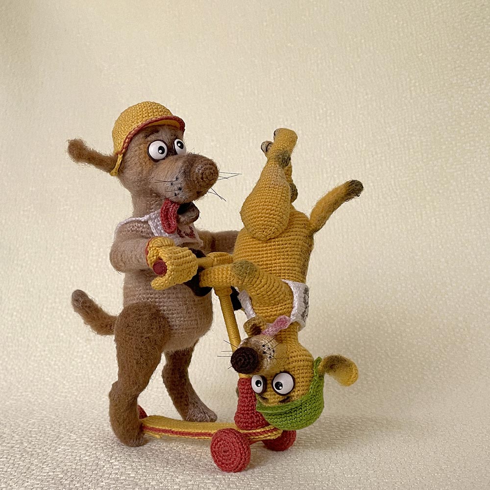 Псы самокатчики - Дизель и Баламут. Связаны из Ализе лана голд 800 (рост собаки13 см) и Ализе ангора голд омбр батик (рост игрушки 17 см).