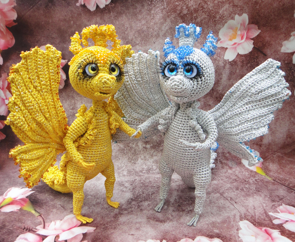 Дракоша ростом 16 см без учёта короны и рожек,связан из YarnArt Bright -пряжа с мерцающим блеском,игрушка на проволочном каркасе-ручки и крылья сгибаются,глаза стекло,дракончик в ручную расшит бисером.МК Татьяны Зинчук.