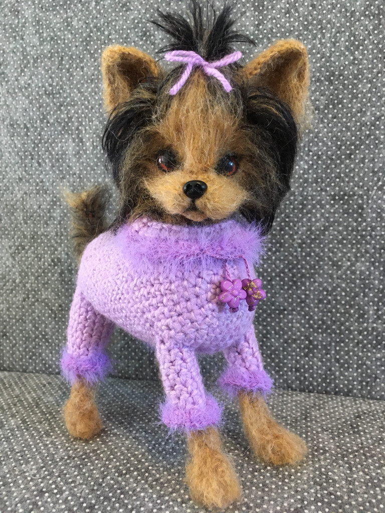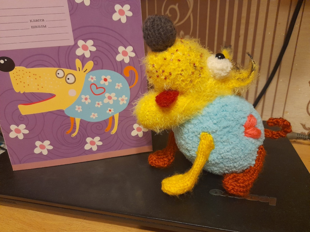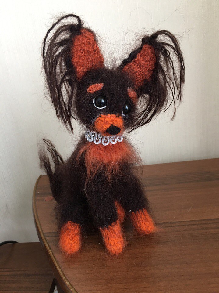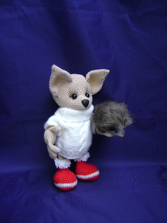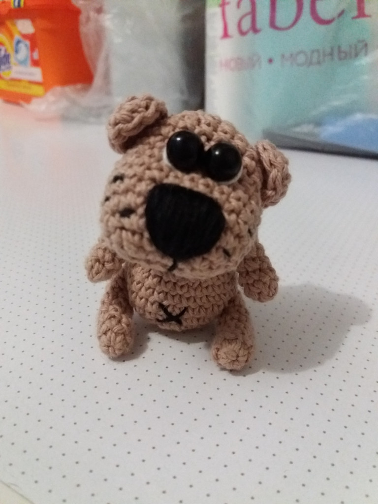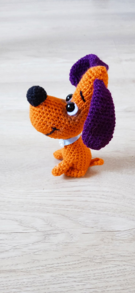 А у меня первая вязаная собачка по МК Татьяны Коротких. Чудной получился, но доченька себе его забрала, сказала, что он хороший.