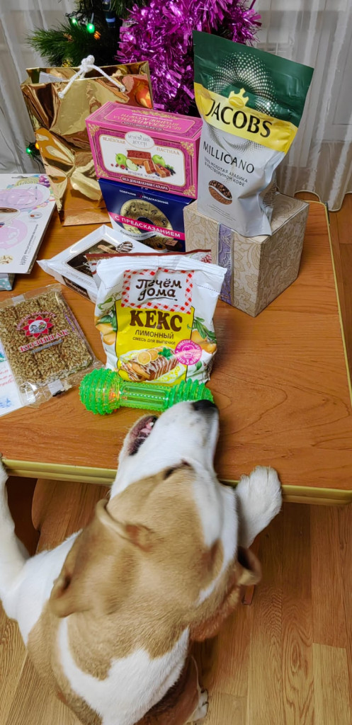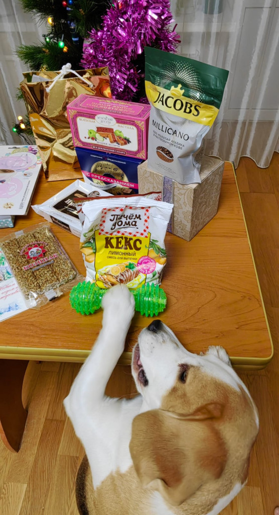 Посылочку от своей Снегурочки Маргариты @Зебрина я открыла буквально за пару часов до боя курантов! И открывала с большим трудом. Знаете почему? потому что четыре мужские руки тянулись за сладостями, а наглая, но очень милая и любимая морда за своей игрушкой. Изображение