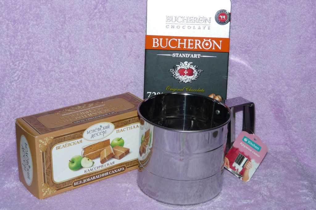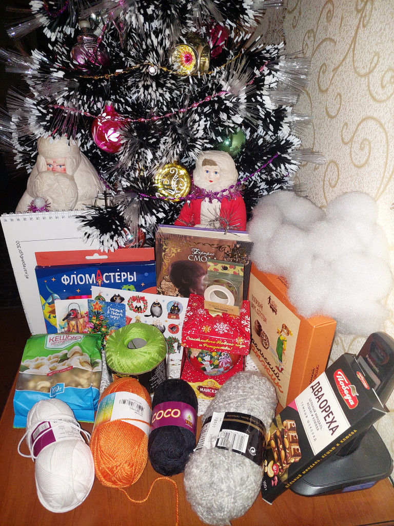А уж сколько всего досталось после :homyak: :homyak: :homyak: : любимая пряжа, крем для рук, мыло снеговик, кухонное полотенчико, теплые насочки (я в них завтра на работу пойду, у нас наконец-то Зима - 16 и северный ветер, дубак), заколка, календарик (уже на холодильнике), елочная игрушка, бенгальские огни (13 числа зажгу), шоколад, пастила и так нужное мне кухонное сито; я даже и не надеялась, что оно мне придет (у на не найти, но моя Снегурочка волшебница, смогла отыскать).