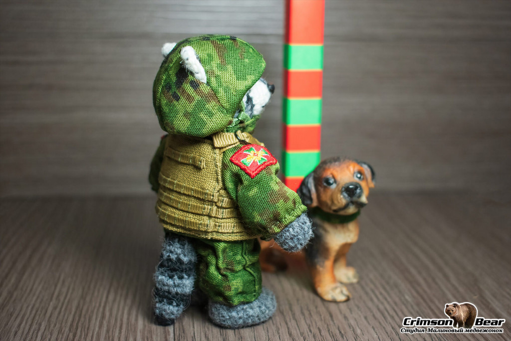 Енот пограничник. Нашивки погранвойск и РФ. Тактический бронежилет плитник с функциональной системой креплений. Композитная каска: усиленная основа плюс камуфляжный чехол. Пограничный столб и служебная собака в комплект не входят.