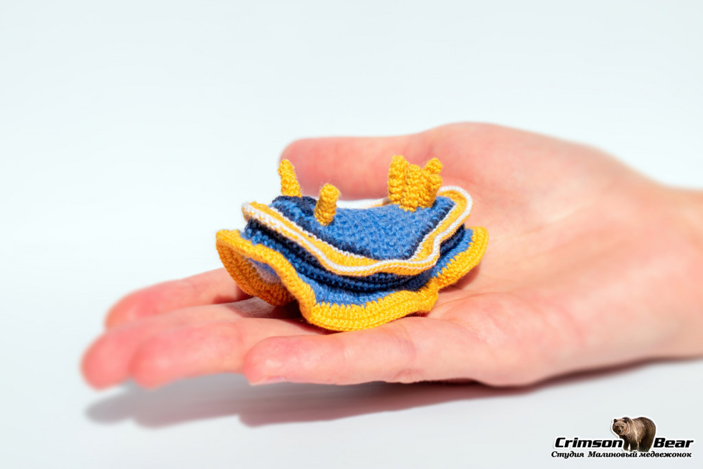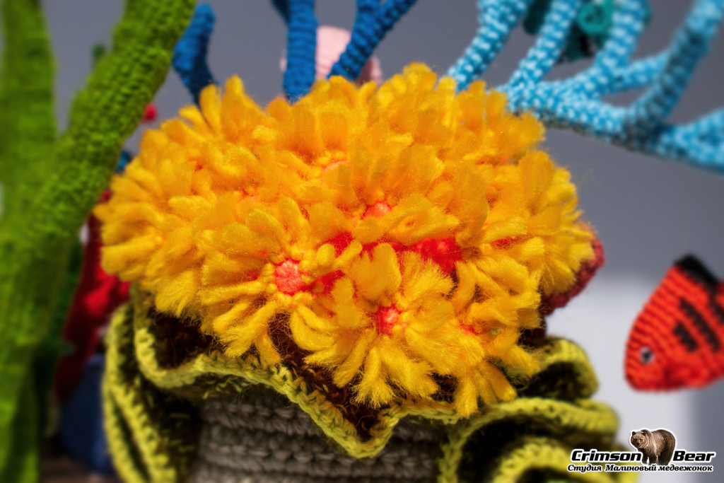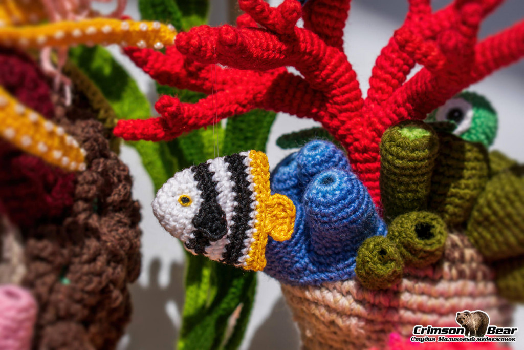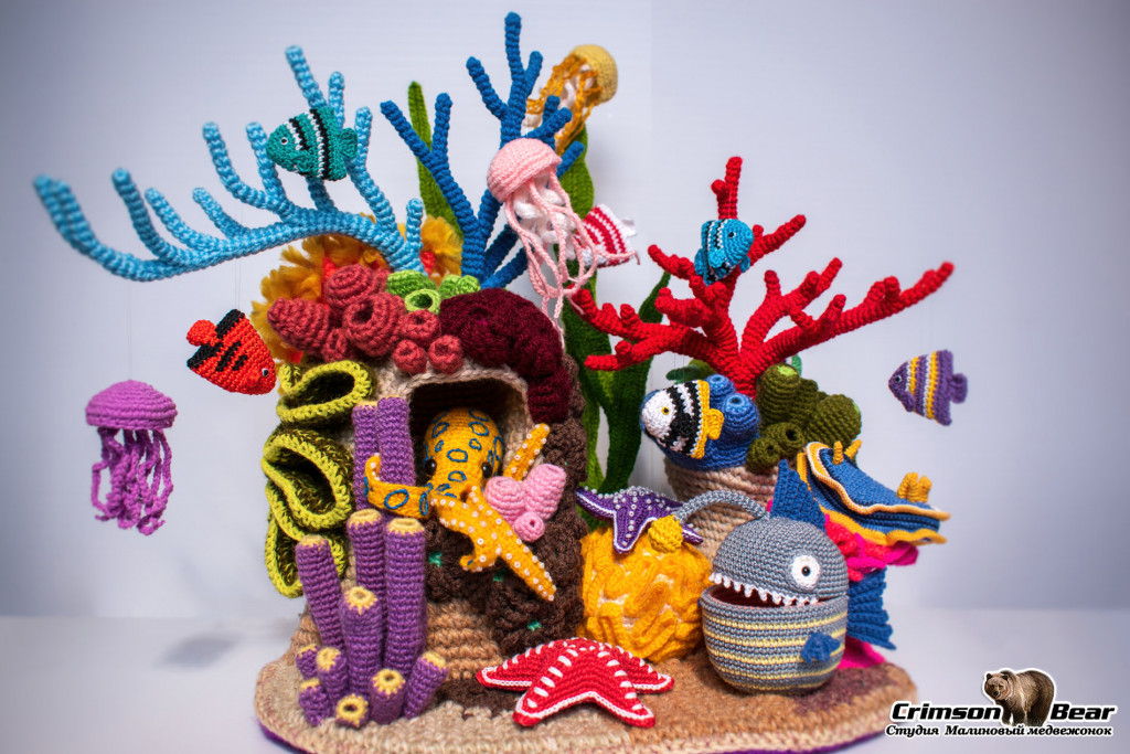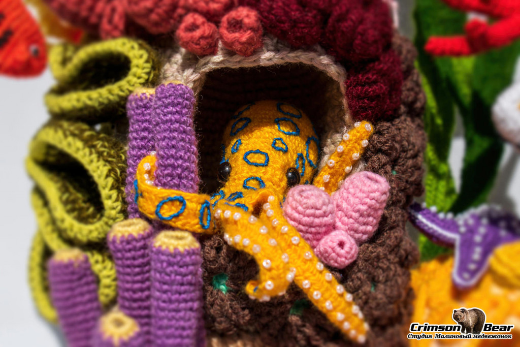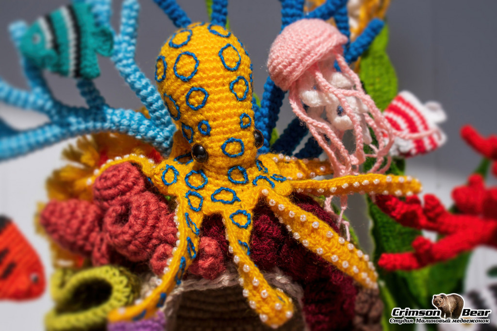 Размер основания композиции 28х20 см., высота 33 см. Длина осьминога с щупальцами 14 см. Маленькие рыбки по 4 см. Моллюск хромодорис 8 см. в длину. Кораллы выполнены из пряжи с проволочным каркасом. Основание композиции и камни выполнены с применением гофрокаркаса. Изделие относится больше к сувенирной категории, но отдельные элементы, в частности представители морской фауны по отдельности могут служить как игрушки для детей от 3х лет.