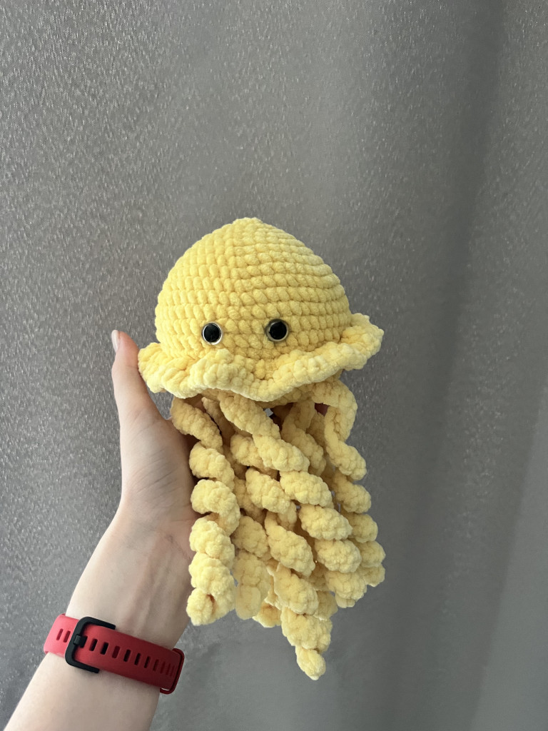 Размер основания композиции 28х20 см., высота 33 см. Длина осьминога с щупальцами 14 см. Маленькие рыбки по 4 см. Моллюск хромодорис 8 см. в длину. Кораллы выполнены из пряжи с проволочным каркасом. Основание композиции и камни выполнены с применением гофрокаркаса. Изделие относится больше к сувенирной категории, но отдельные элементы, в частности представители морской фауны по отдельности могут служить как игрушки для детей от 3х лет.
