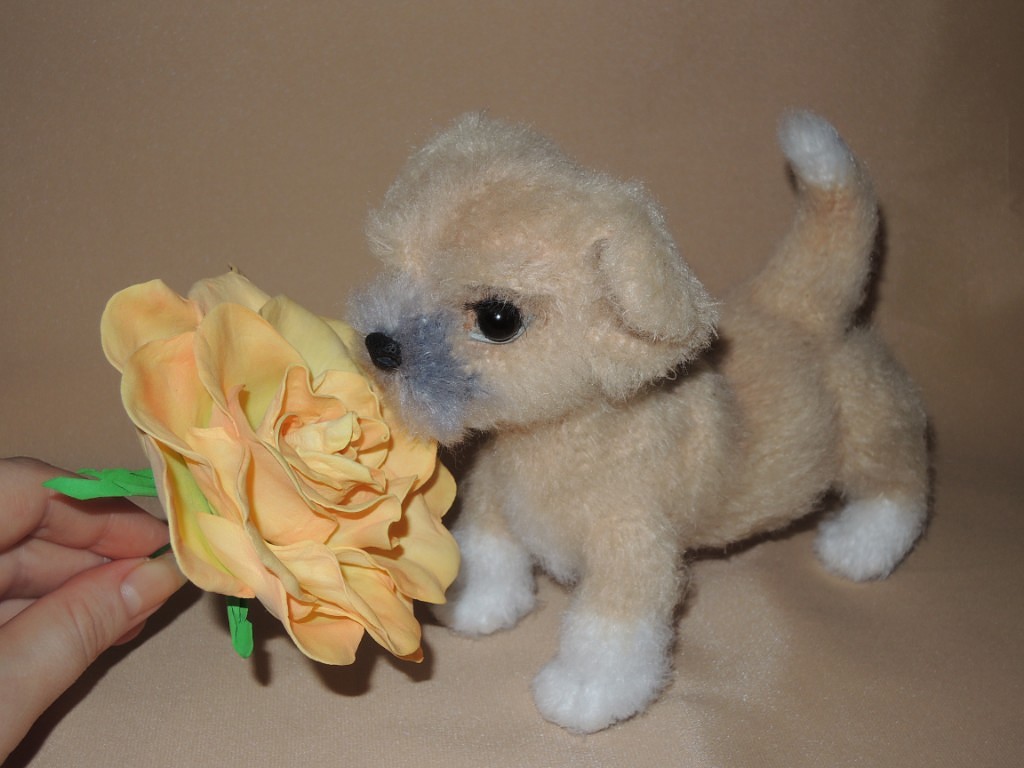 Связан из полушерстяной пряжи, набивка синтепон. Лапы на проволочном каркасе, голова на шплинтовом креплении.