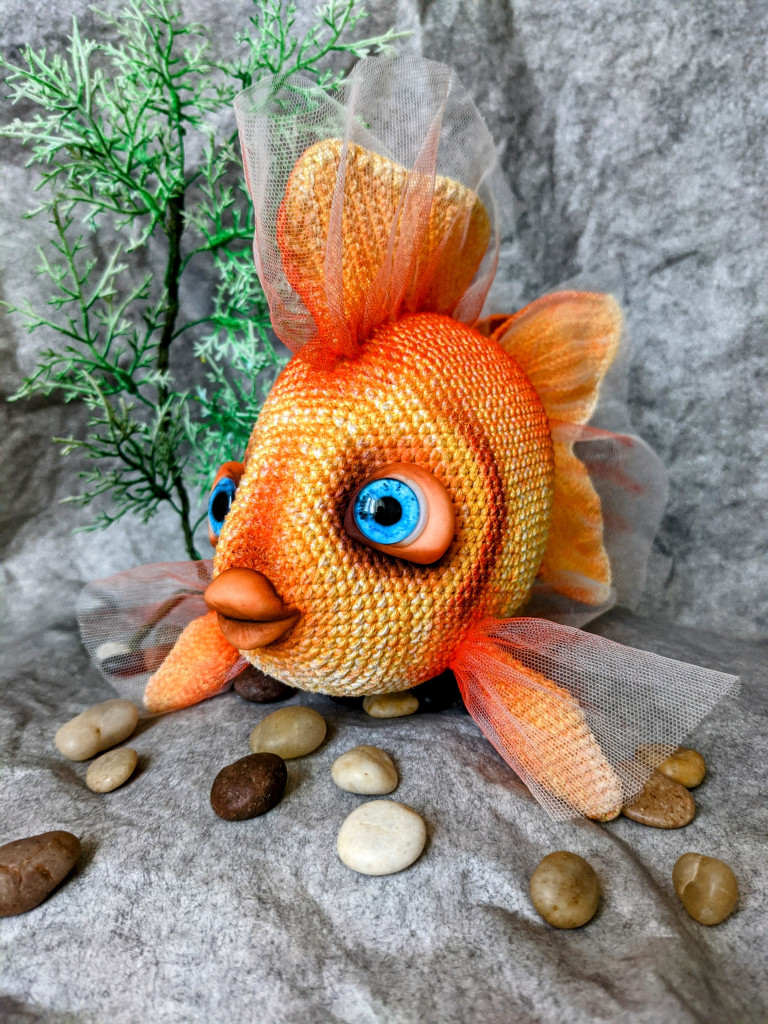 Пряжа Vita Coco + Пехорка Ажурная, крючок 1.5, проволока сечением 1.5, бисерная проволока 0.6, тонировка - акриловые краски + художественная пастель, полимерная глина Fimo, фатин, глазки 16мм. Размер тельца без учёта плавников в длину ок 15см, в высоту ок 11см.