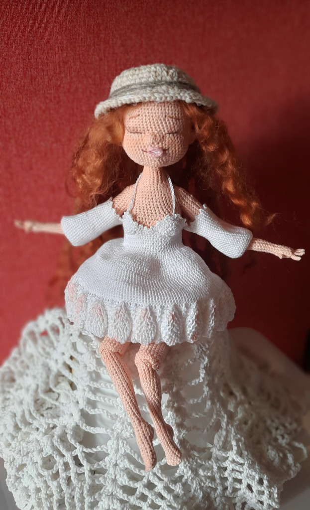Всем здравствуйте, эта куколка была связана в онлайне с Еленой Шаповаловой. Из пехорки ажурной,крючок 0,75