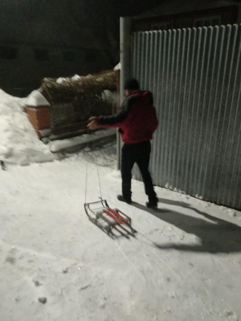 Пока я ждала, когда проснется супруг... на улице началась метель! Поднялся ветер! Но, мы как настоящие "саночники", достали старенькие дочкины санки, на которых перекаталась вся улица, да и соседние улицы тоже! Вытащили их, и я даже 3 раза скатилась! до ворот и не врезалась вних))