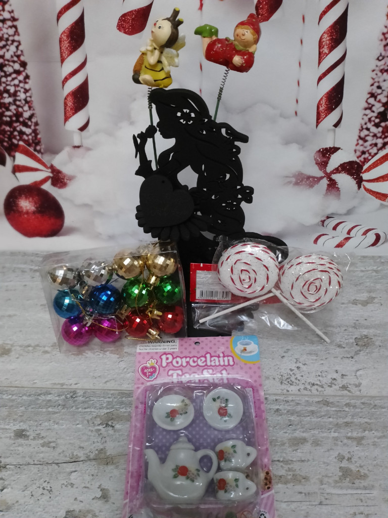 Украшения для елки, вкусности и сладости, детям игрушки, красивая открытка с пожеланиями, пряжа. Чай как раз надо заварить, заварник как раз пустой)