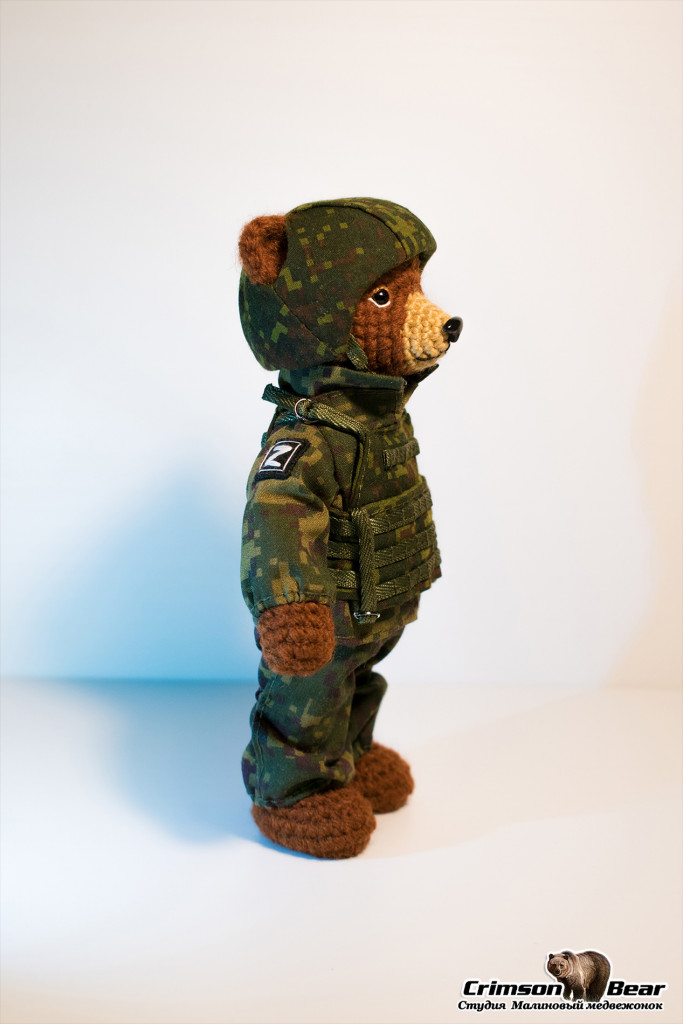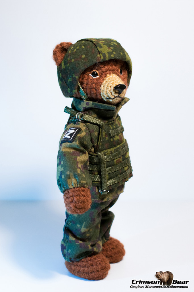 Размер медведя 17 см. Подвижная голова на шплинтовом креплении, лапы на меднопроволочном каркасе. Каска из композита, сверху камуфляжный чехол. Нашивки флаг РФ и Z.