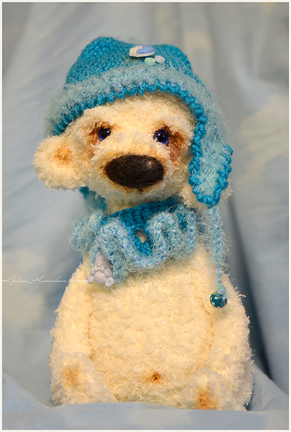 Мишка связан по описанию Ольги Гаевской, рост медвежонка 9 см, пряжа микровелюр, крючок 1.00. Одежда и колпак съёмные.