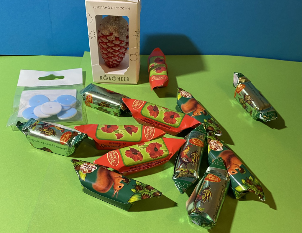 Вот и я сейчас отчитаюсь. Дома темно. Фотографировать ужас как трудно. Но! Приступим...Много-много всего! Все такое новогоднее! Игрушки, халва, шоколад! Флажки на ёлку! У меня есть набор из моего детства, набор из детства дочки, а теперь получается из детства внука...