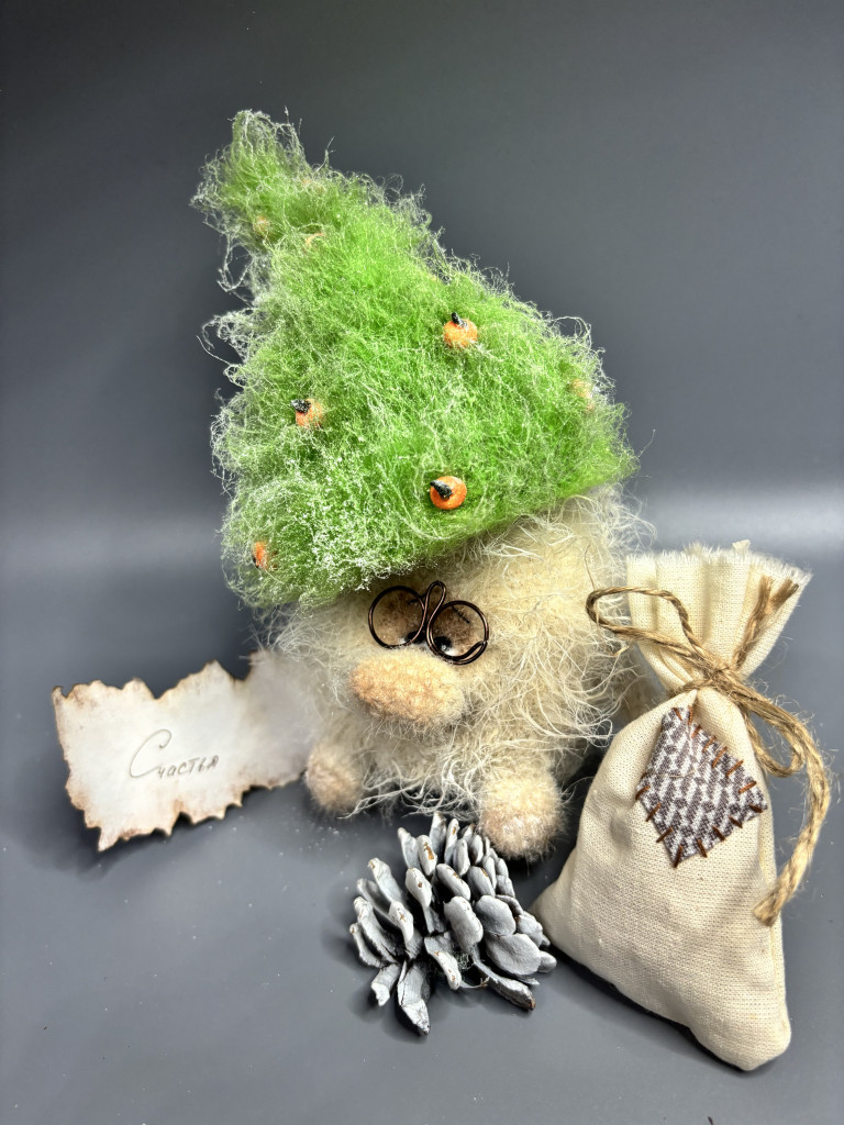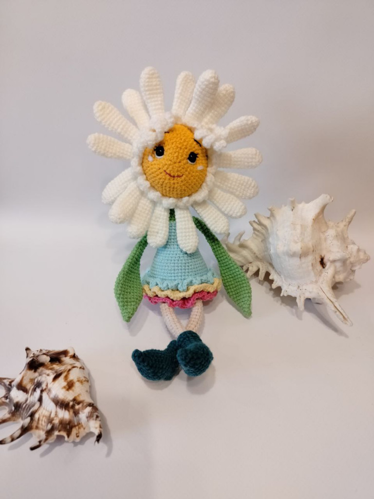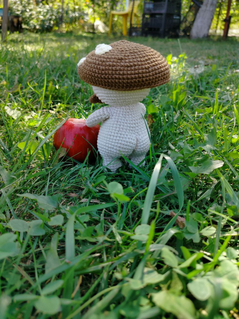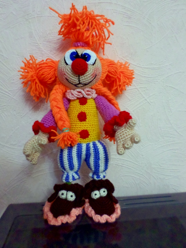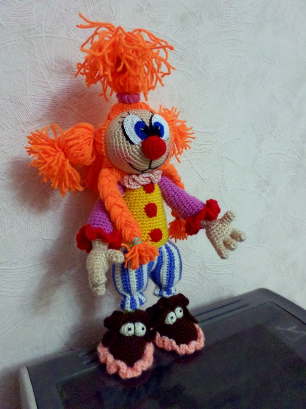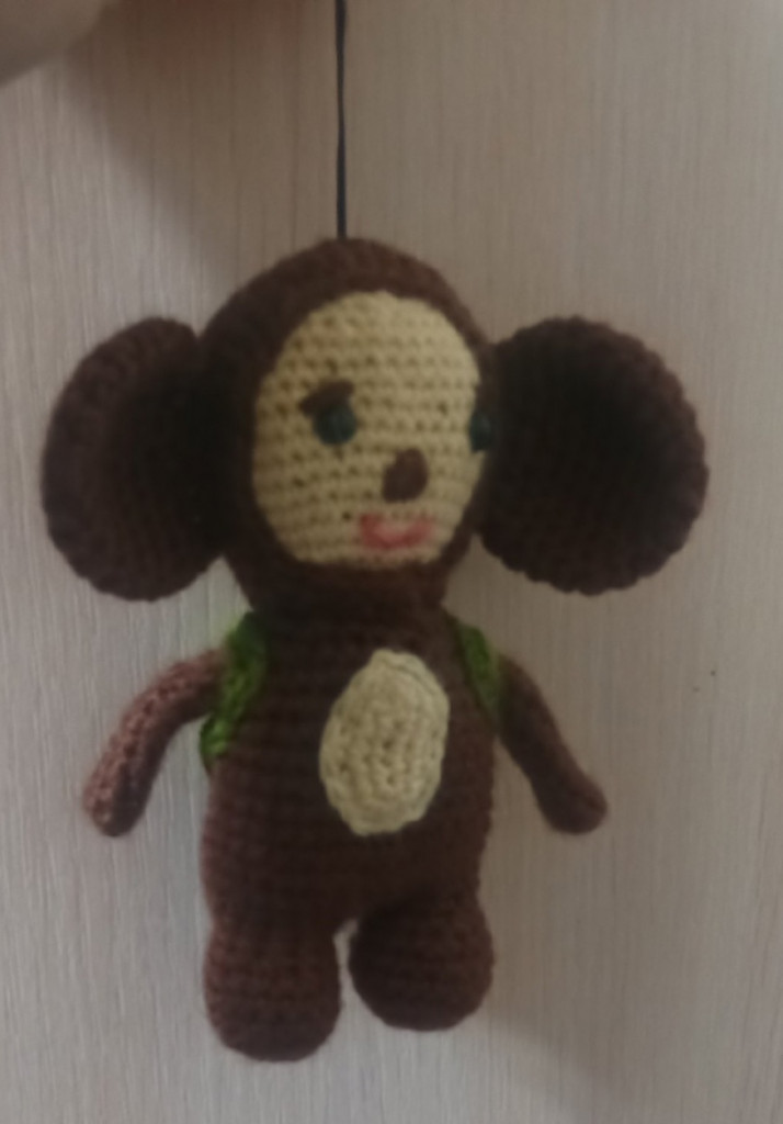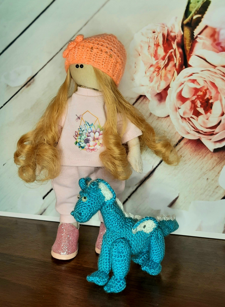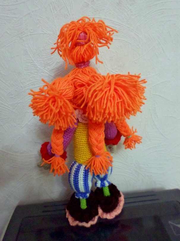 Голова связана крючком, ноги и руки обвязанные деревянные бусины, тело сделано из ткани.