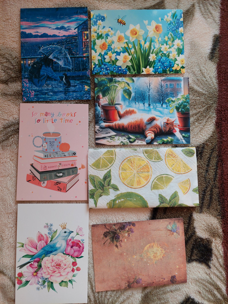 Я получила красивый конверт от Жанны @nisana Сам конверт украшен, оборотки лотовых открыток тоже! Еще чистенькие открытки, салфетка с павлинищами и листик для оформления.