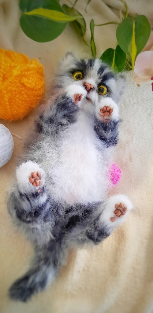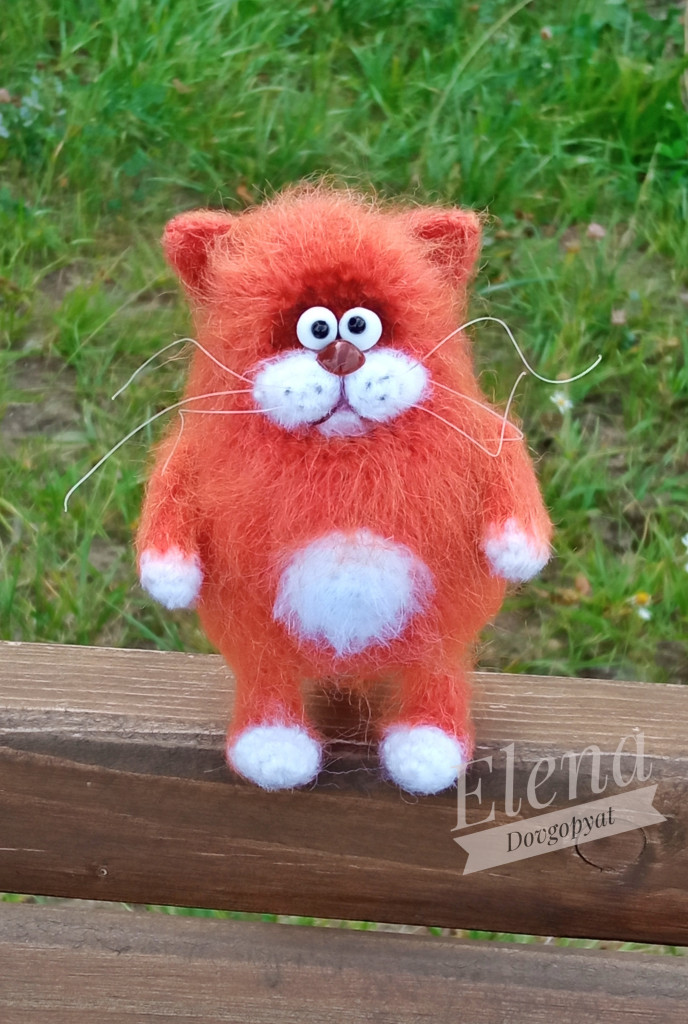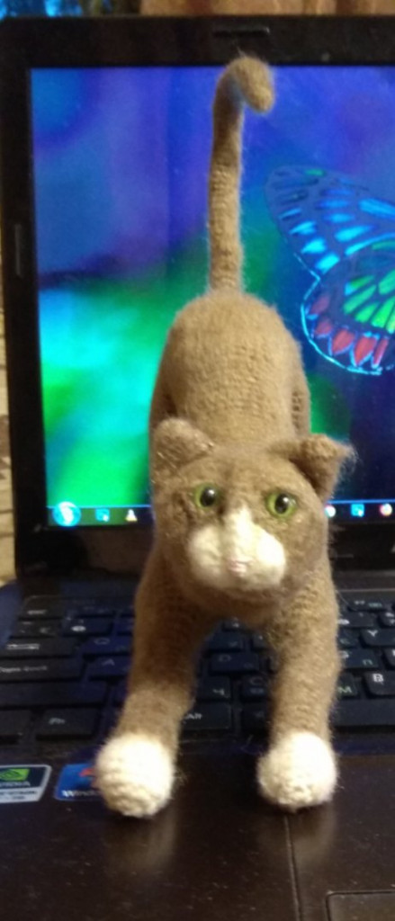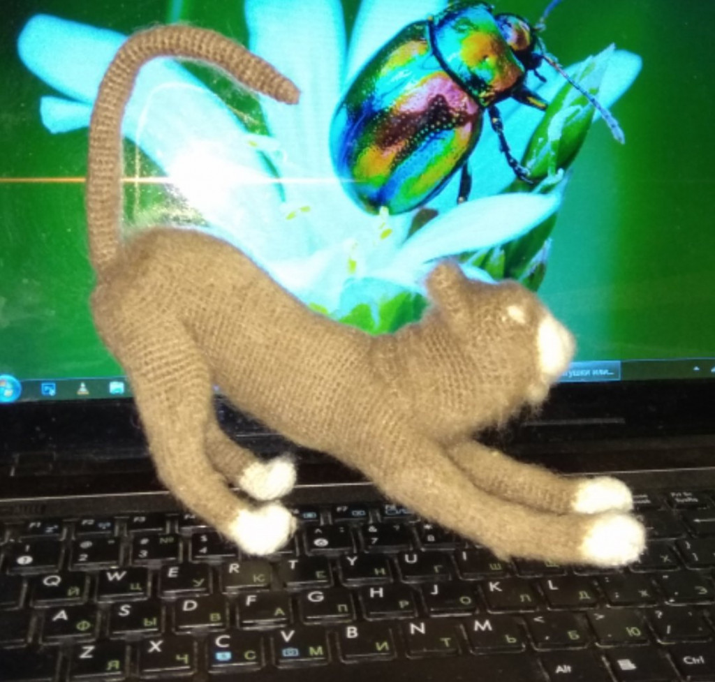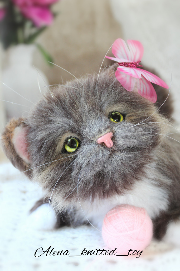 Котенька в смешанной технике, спицы и крючок.