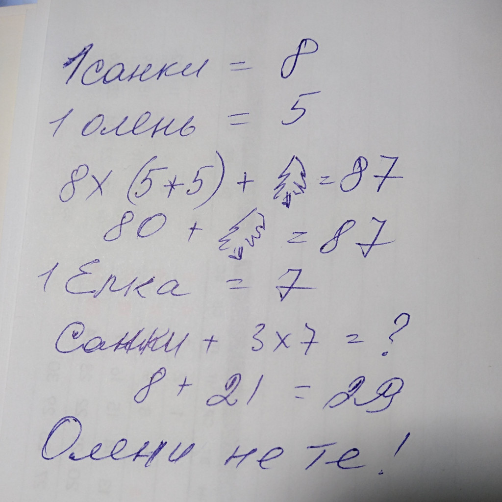 Сани+4 оленя+ 3 елки=8+(4×5)+(3×7)=49