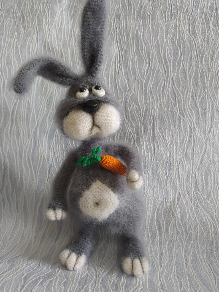 Связаны заюшки из Real 40 Alize крючком 1,5, ростом 6 см (без учета ушей). Все детальки ввязываются в процессе вязания, пришивные только ушки. В МК входит два описания морковок. Можно связать совсем плоскую игрушку и использовать её в виде броши и магнитика, а если набить поплотнее, то получится замечательная ёлочная игрушка или брелок.