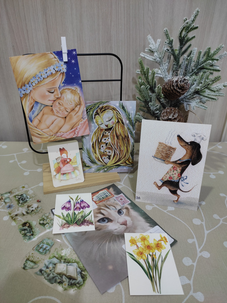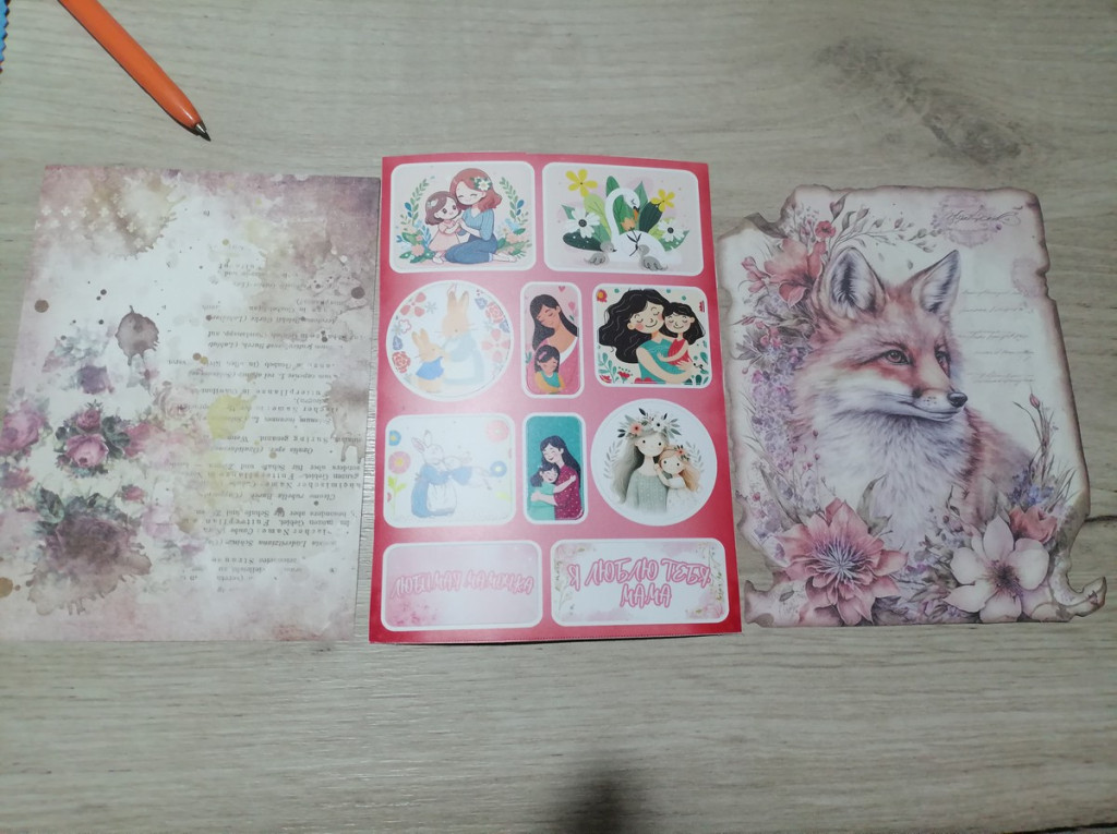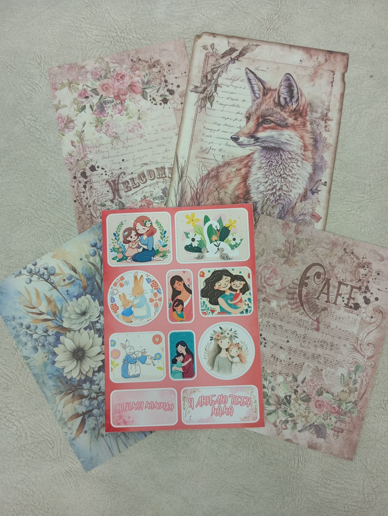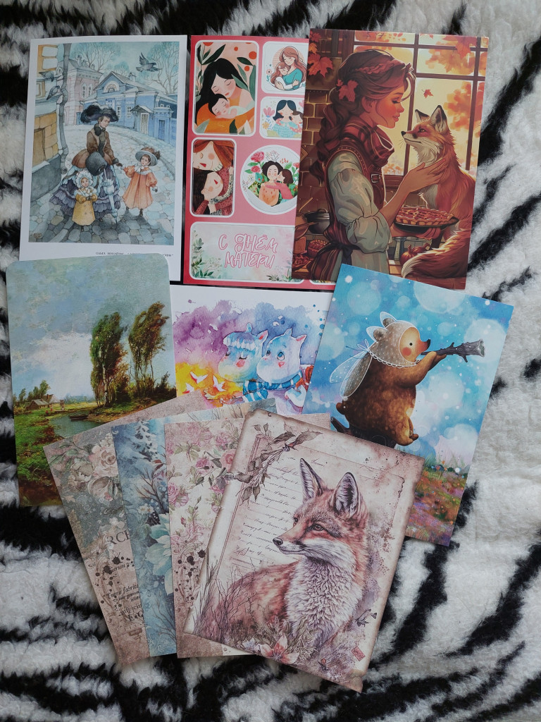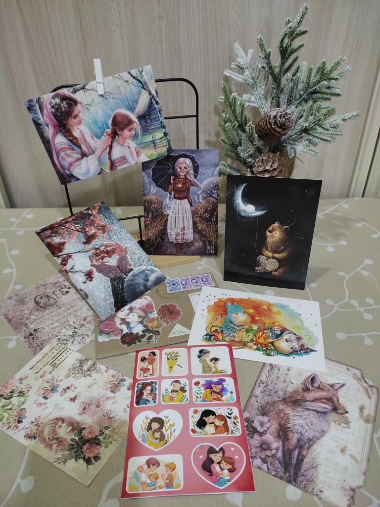 Я получила сюрпризную открытку по обмену "Мать и дитя" от Жанны @nisana и много подарочков: красивые открытки, наклеечки, бумагу для украшения. Спасибо, Жанна!