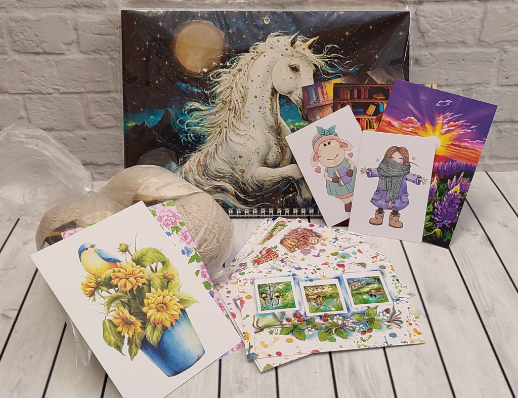 Сладостей, то сладостей! Они ж из посылки во много раз вкуснее. Правда первое, что увидела открыв посылку - символ наступающего года и у меня уже есть календарь на следующий год. Пряжа удивительно нежного цвета. А открытки! Такой интересный набор " Времена года", люблю такие открытки. Сашенька, спасибо за поздравления, за теплые слова, за чудесного трогательного чудика, за такой калейдоскоп подарков!