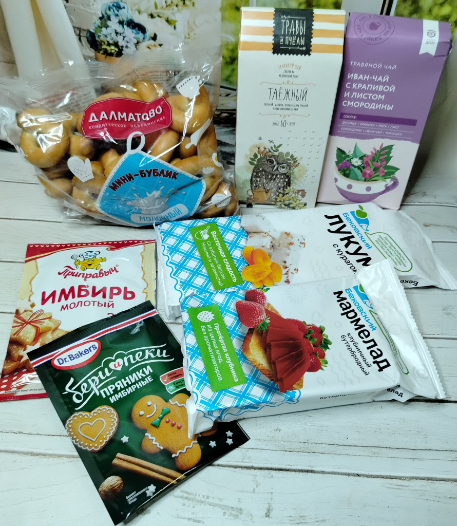 Лукум, мармелад, бублики уже попробовала. Чай травяной: с душицей, зверобоем, листом смородины и ягодами рябины и шиповника. Мне сейчас он прямо необходим, так как болею сильно, три дня просто лежала с температурой. Да, а еще имбирь молотый и умесь доя имбирных пряников. Как раз к Новому году.